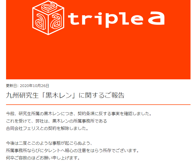 九州研究生「黒木レン」に関するご報告 今般、研究生所属の黒木レンにつき、契約条項に反する事実を確認しました。 これを受け ...